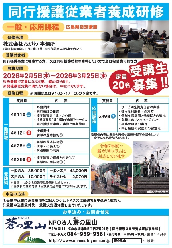 ※同行援護とは、視覚に障がいがあり、外出が困難な方への福祉サービスです。地域で生活されている視覚障がい者の方にとって重要な支援の一つです。当法人では同行援護のサービスを行うための同行援護従業者養成研修を受講することができます。