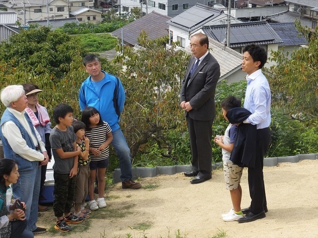 この度、皆さまのご協力をいただき2月より着工いたしました「柳津の丘」が、ほぼ形となりました。誠にありがとうございました。落成式ではキンモクセイの植樹式や子どもたちと共に合唱や国会議員の小林史明氏もご参加くださりお祝いしました。式典終了後は皆さまとバーべキューを楽しみました。